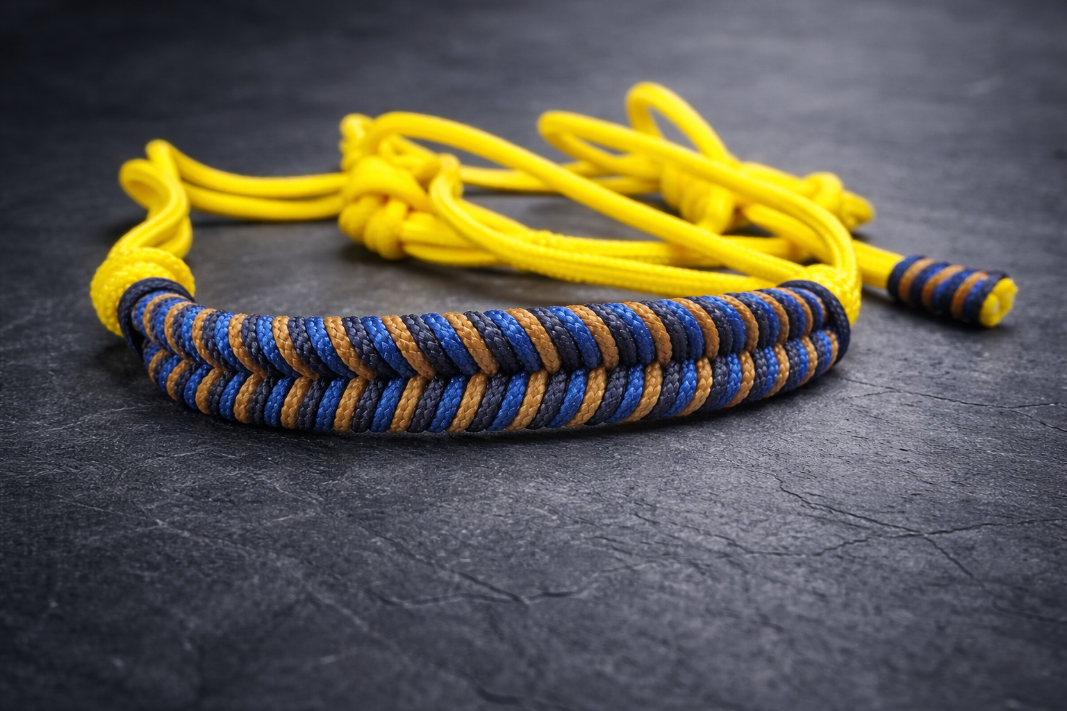Corde Jaune canari, tressage caramel, bleu élèctrique et bleu foncé